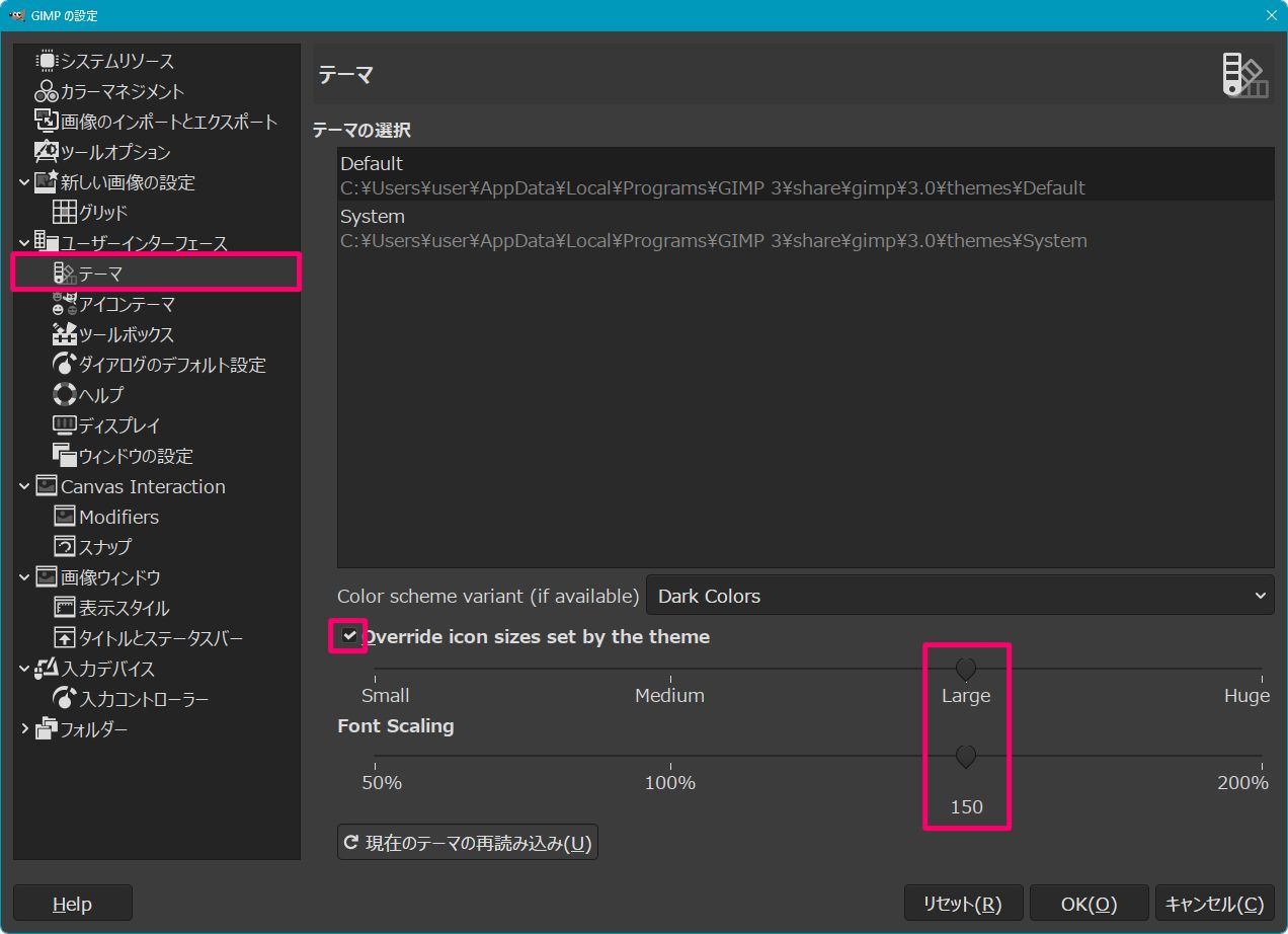 但し、この設定によってGIMPのデフォルト表示ではフォントやアイコンが小さく表示されてしまいますので、必要に応じてGIMP側の設定からGUI(ユーザーインターフェース)の表示サイズを調整してみてください。