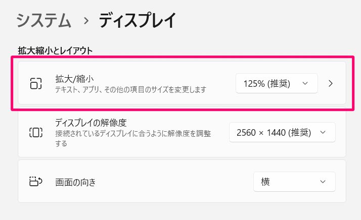 Windowsの「設定」を開いて「システム」という項目から「ディスプレイ」を開くと、「拡大縮小とレイアウト」のセクションに「拡大/縮小」の項目を見つけることができます。(Windows 11 バージョン24H2で確認)