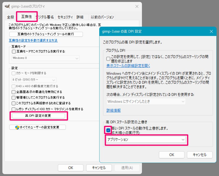 GIMPの実行ファイル(プロパティ)で「高DPI設定の変更」を行う