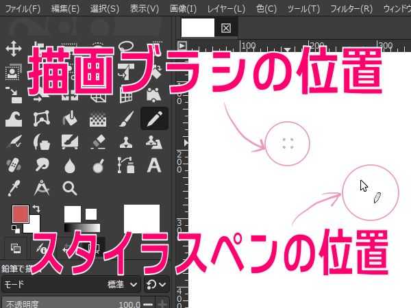 ところが、この拡大率が影響してGIMPの描画領域となるキャンバス(デバイスコンテキスト)上の描画ブラシの位置が、液晶タブレット上で実際に検知されているスタイラスペンの位置(カーソルやマウスポインターの表示)からズレてしまうという問題を抱えています。