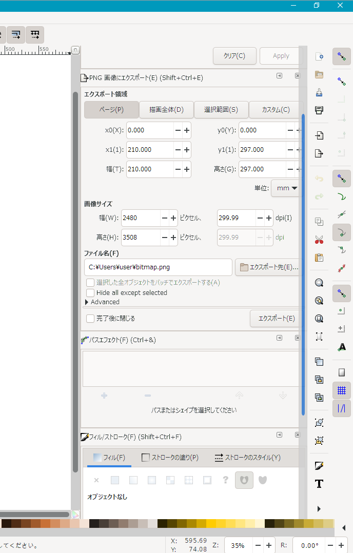 このユーザーフォルダに保存されるバックアップファイルは Inkscape が強制終了されるときに緊急避難的に保存されるものなので、ファイルを開いたらすぐにファイル名を付けて作業用フォルダに保存しておきましょう。